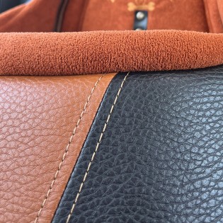 - The exterior is made of eco or genuine leather - eco for standard class, geniune for premium. Exterior is breathable and hypoallergenic. The inside is made of scratch-resistant velvet upholstery fabric.